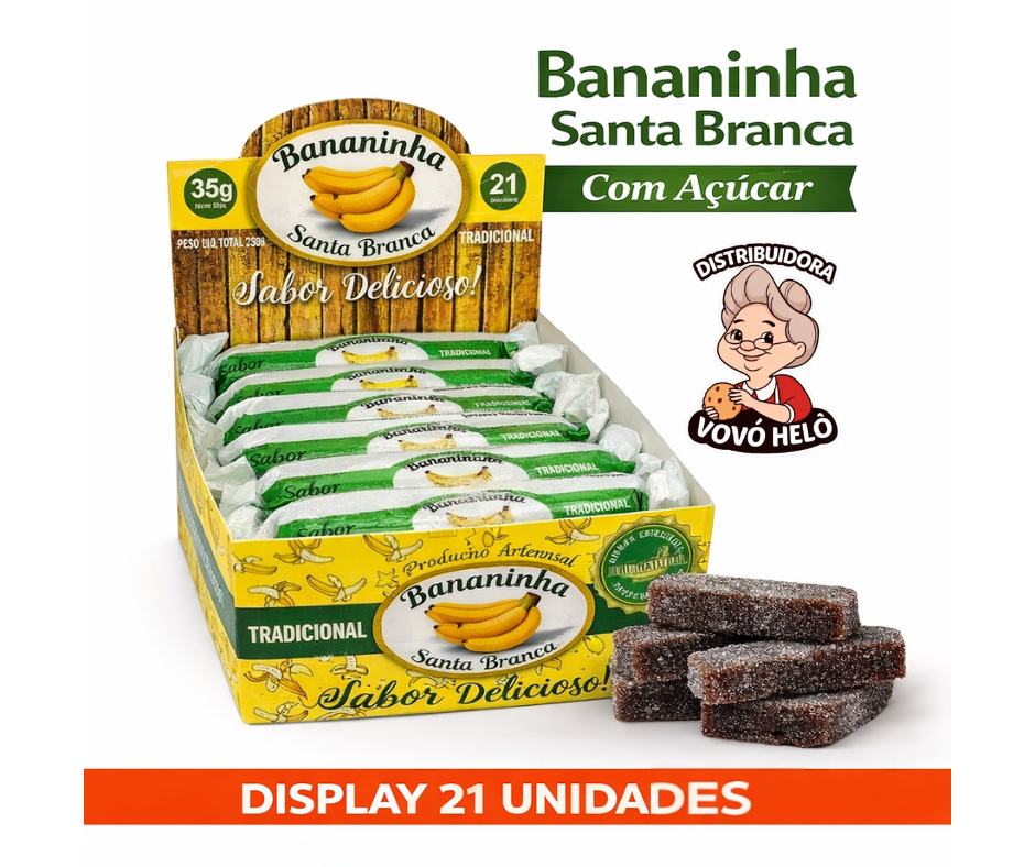 A Bananinha Santa Branca Tradicional é produzida artesanalmente na cidade de Santa Branca, interior de SP, seguindo uma receita exclusiva guardada há anos. A banana utilizada é cultivada e colhida pela própria fábrica, garantindo qualidade, frescor e sabor incomparável.